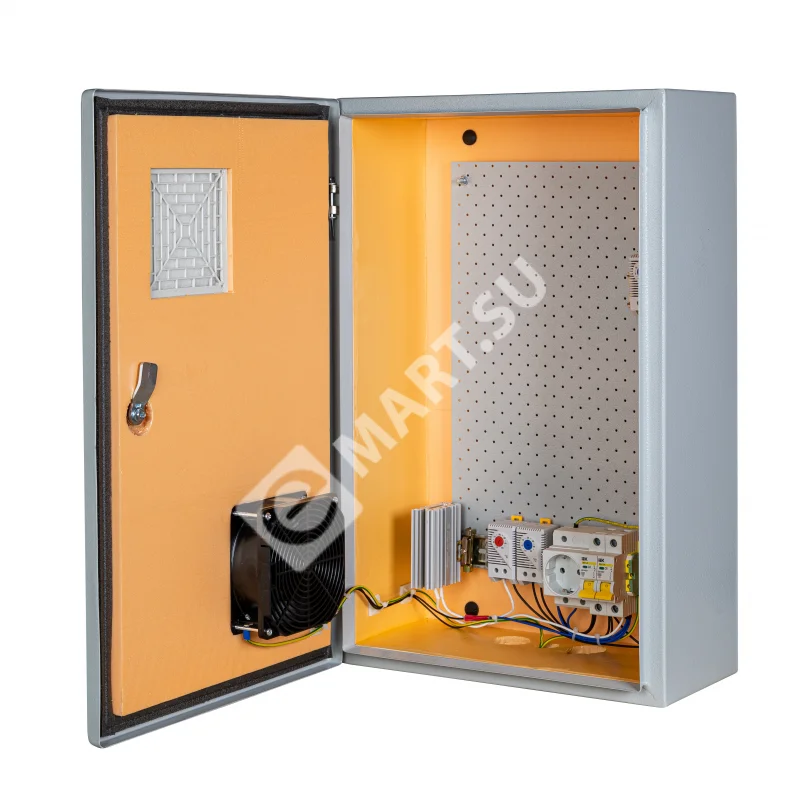 Климатический навесной шкаф Mastermann-3УТПВ-А (Ver. 2.0) IP 54 с вентиляторными решетками, вентилятором (активная вентиляция) и защитным реле от "холодного пуска". Предназначен для использования в любых климатических условиях на улице (-55°С +50°С)