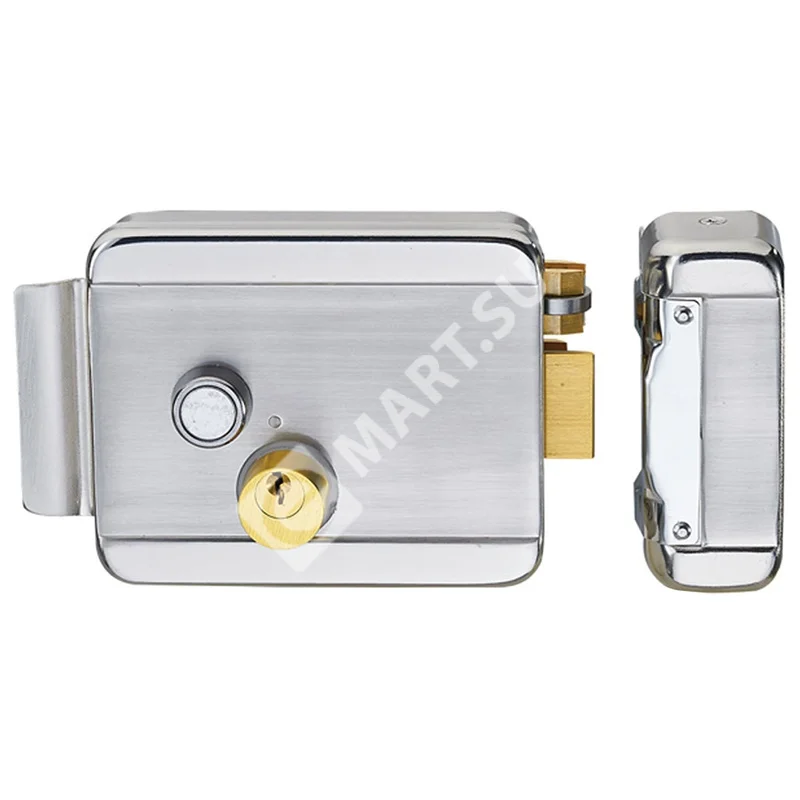 HN-RJ105B – накладной электромеханический замок с блокировкой кнопки. Выполнен из стали с никелированным покрытием, что допускает эксплуатацию замка не только в помещении, но и на улице. Замок является универсальным и может быть установлен на правосторонние и на левосторонние двери. Универсальность достигается благодаря специальной конструкции собачки и переворачиваемой защелке. Блокировка кнопки предотвращает несанкционированное открытие. В отличие от замков других производителей, изменение положения защелки производится без сложных манипуляций и без разбора корпуса.