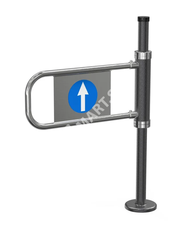 Калитка является односторонней (правой): дуга проворачивается только в одну сторону — на 90° по часовой стрелке. После прохода дуга автоматически возвращается в исходное положение под действием возвратной пружины и гидравлического доводчика, надежно перекрывая проход. Это идеальное решение для организации направленного движения в узких проходах.