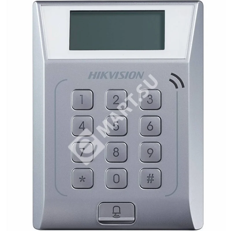 Терминал контроля доступа Hikvision DS-K1T802M с встроенным считывателем карт Mifare предназначен для быстрой и легкой организации одной точки прохода. Простое в установке устройство готово к работе (не требует сборки), функционирует автономно. Поддерживает несколько режимов идентификации (карта, карта + пароль, etc). Емкость памяти — 3000 карт, 10 000 событий. Дальность действия встроенного считывателя карт Mifare — 20–50 мм, рабочая частота — 13.56 МГц. DS-K1T802M построен на 32-битном процессоре 1 ГГц (ОС — Linux), укомплектован механической клавиатурой на 13 клавиш, LED-индикатором (питание, коннект), STN экран (дата, время), зуммером. Интерфейс — TCP/IP, 2 тревожных входа — Exit Button, Door Sensor, 2 тревожных выхода — Doorbell, E-lock Output. Питание — DC 12 В, рабочий ток — 0.17 А (без замков). В режиме максимальных нагрузок устройство потребляет не более 3 Вт. Габариты — 1228223 мм, вес — 150 г. Рабочие условия: температуры -20 °C… +65 °C , влажность 10–90 % (без конденсата). Сертификация — CE, FCC.