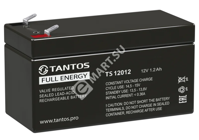 TS 12012 ∙ Аккумулятор 12В 1,2 А∙ч Tantos АКБ свинцово-кислотная, AGM Свинцово-кислотные аккумуляторы TS предназначены для резервного электропитания приборов, систем охранной и пожарной сигнализации. • Основные сферы применения аккумуляторов серии TS: ∙ Системы безопасности ∙ Электронные кассовые аппараты ∙ Электронное тестовое оборудование ∙ Системы аварийного освещения ∙ Расчетный срок службы: до 3 лет ∙ Предназначены для работы как в буферном, так и в циклическом режимах