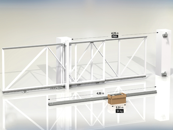 FOLLOW ME S 4,25 — это готовый профессиональный комплект для сборки и монтажа двухсекционных телескопических откатных ворот шириной проезда до 4,25 метров. Система создана для экономии пространства, где нет возможности отката стандартной одностворчатой конструкции в сторону. Ворота открываются по принципу «гармошки», где одна створка заезжает за другую.