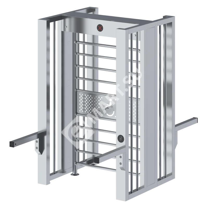 Полноростовый турникет с единой калиткой используется для контроля и ограничения доступа посетителей (в том числе с колясками, велосипедами, и людей с ограниченными возможностями) на объект. Обеспечивает поочередно вход и выход. Основная секция предусматривает только проезд инвалидов, людей с колясками и велосипедистов. Устанавливается как самостоятельным блоком, так и составе модульного заграждения из нескольких турникетов. Управление турникетом осуществляется при помощи подключения к СКУД, встроенными считывателями, либо пультом ДУ. Модель полноростового турникета с калиткой обладает высокой проходной способностью (20-35 чел/мин), автоматической функцией разблокировки ротора при аварийных ситуациях или сбое электропитания, пониженным энергопотреблением. А технические возможности устройства обеспечивают корректную интеграцию в системы СКУД любых производителей. Автоматическая калитка с электроприводом — дистанционное открывание, закрывание и блокировка входа/выхода. Нормально закрытое состояние, предусмотрена ручная принудительная разблокировка ключом и эвакуационный режим «антипаника». Надежная безопасная конструкция — сварная рама из нержавеющей стали, защита от пыли/влаги IP 54. Установка в помещениях и на улице (требуется навес). Отсутствуют травмоопасные элементы для маломобильных групп населения. Световой сигнализатор направления прохода. Интеграция в СКУД — возможность сборки нескольких терминалов в единую цепь (механически и программно). Готовый к применению модуль — стандартный разборный ротор, считыватели карт и установочный набор в комплекте, материнская плата с возможностью подключения дополнительных устройств (металлодетектора, биометрических сканеров, видеокамер).