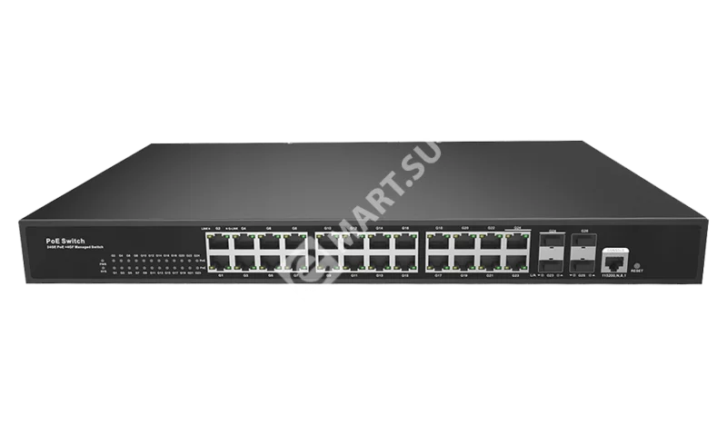 Общее количество портов: 26; Количество портов PoE: 24; Сетевой интерфейс PoE: 10Base-T/100Base-TX/1000Base-T; Количество Ethernet - портов (SFP): 4; Сетевой интерфейс Ethernet (SFP): 100BaseSX/LX; 1000BaseSX/LX; Тип Ethernet-портов: Комбинированные (23-24 порт), Независимые (25-26 порт); Консольный порт: RJ45; Максимальная дальность передачи по витой паре: 100 М; Стандарт PoE: 802.3af; 802.3at; Максимальная мощность на порт: 30 Вт; Бюджет PoE: 578 Вт; Тип управления: L2+; Удаленный мониторинг: SNMP (v1/v2c/v3); RMON; Электропитание: AC 100-240 В до 600 Вт ; Диапазон рабочих температур: -20°С...55°С; Габаритные размеры: 440(Д)х440(Ш)х44,5(В) мм; Высота (U): 1 U