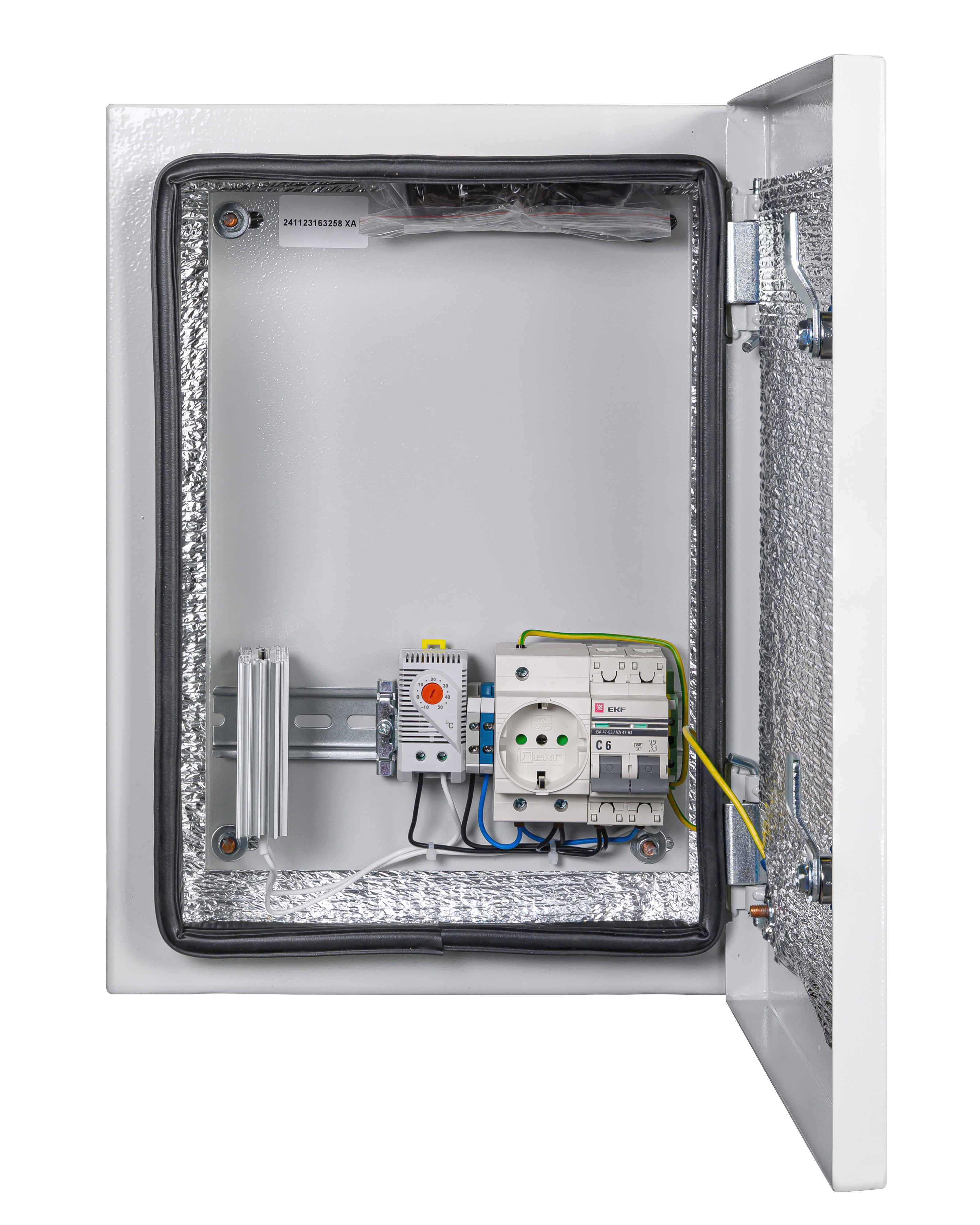 утеплитель из порилекса, замок 2 шт,ключ 1 шт, монтажная плата 1шт, гермовводы 2 шт (MG-25), розетка 1 шт, автоматический выключатель, 6А 1шт, клемма для подключения оборудования 2 шт, клемма заземления 1 шт, термореле 1шт, нагреватель мощностью 50 Вт 1шт.