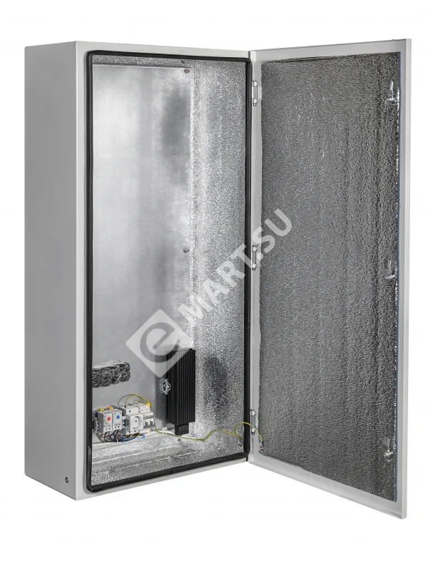 утеплитель из порилекса, замок 2 шт, ключ 1 шт, монтажная плата 1шт, гермовводы 5 шт (MG-25), розетка 1 шт, автоматический выключатель, 6А 1шт, клемма для подключения оборудования 2 шт, клемма заземления 1 шт, термореле 1шт, реле предстарта 1 шт, нагреватель мощностью 150 Вт 2 шт.
