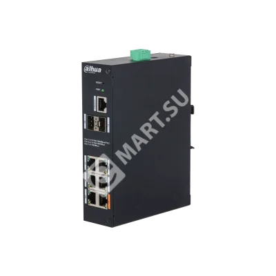 Порты: 4 RJ45 10/100/1000Мбит/с (PoE/PoE+/Hi-PoE/IEEE802.3bt), 2 RJ45 10/100/1000Мбит/с (uplink), 2 SFP 1000Мбит/с (uplink); мощность PoE: порт 1 до 60Вт, порты 2~4 до 30Вт, суммарно до 60Вт; PoE watchdog; питание: 53В(DC); грозозащита: до 6кВ; рабочая температура: -30°С~+65°С; монтаж на DIN-рейку.