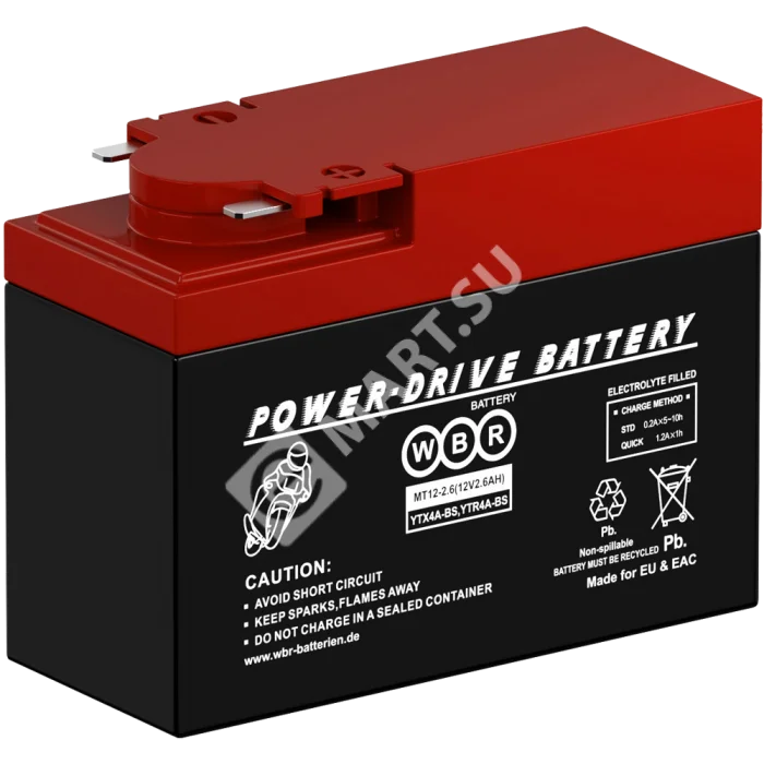 Аккумулятор WBR МТ12-2,6 - герметизированная, выполненная по технологии AGM, необслуживаемая (MF) стартерная мотоциклетная свинцово-кислотная аккумуляторная батарея. Обладает высоким качеством и надежностью. Она предназначена для запуска двигателя мотоциклов, скутеров, гидроциклов, квадроциклов, снегоходов и мотовездеходов. Батарея соответствует техническим характеристикам и является аналогом мотоциклетных аккумуляторных батарей YUASA модели YTX4A-BS.