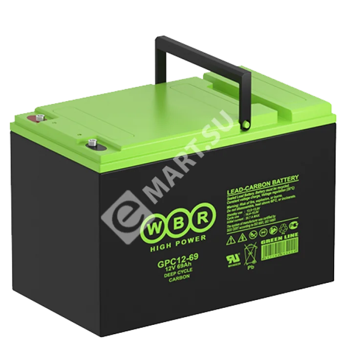 Аккумулятор WBR GPC12-69 - герметизированная, карбоновая, свинцово кислотная, аккумуляторная батарея со сроком службы 15 лет или более 1900 расчетных циклов заряда-разряда в циклическом режиме при 70% разряде. Эта высокоэффективная, перезаряжаемая батарея не требует обслуживания в течение всего срока службы и за счет использования чистого свинца, а также добавки углерода в состав электродов получили улучшенные зарядные и разрядные характеристики.