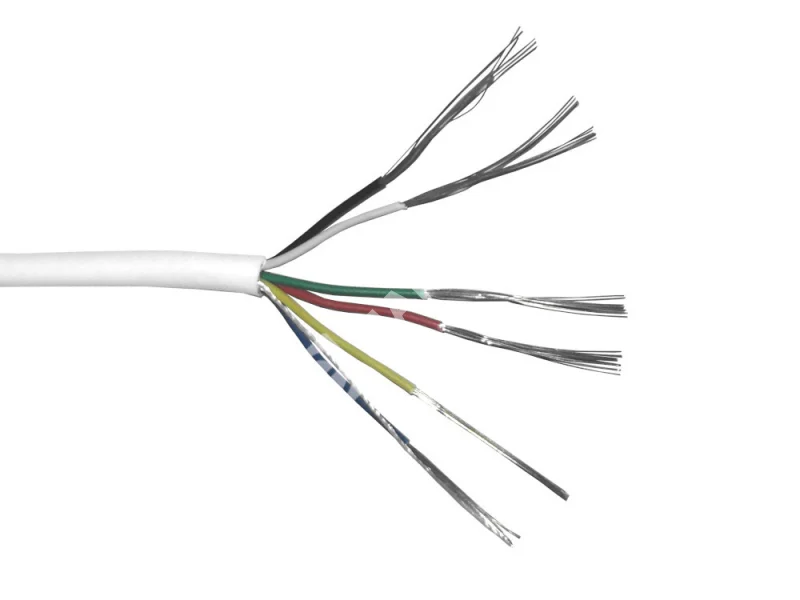 Сигнальный кабель, неэкранированный Количество проводников: 6 Сечение проводника: 0,22мм2 Каждый проводник состоит из 7 волосков диаметром 0,2мм Материал жилы: TinCCA луженый омедненный алюминий Бухта: 100 м (пластиковая катушка) Диапазон температур: хранение от -20С до 40 С монтаж от -10С до 50 С эксплуатация от -40С до 60 С Внешний диаметр кабеля: 4,1мм Сопротивление: 145 Ом/1км Цветовая гамма изоляций жил: 6С: красный/черный/белый/зеленый/желтый/синий