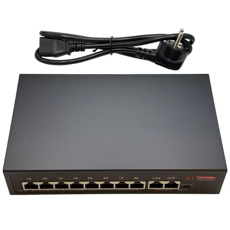- Поддержка стандартов PoE: IEEE 802.3af (PoE, 15.4 Вт) и IEEE 802.3at (PoE+, 30 Вт) гарантируют совместимость с широким спектром IP-камер и других PoE-устройств.